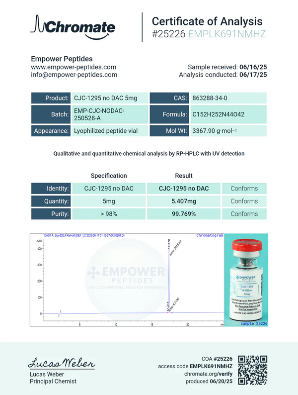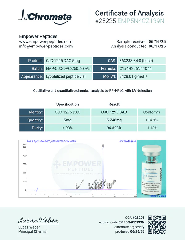 CJC-1295 provides researchers with a reliable tool for examining GHRH-related signaling in laboratory model systems. Store in a cool, dry place. This compound is intended solely for laboratory research use only.