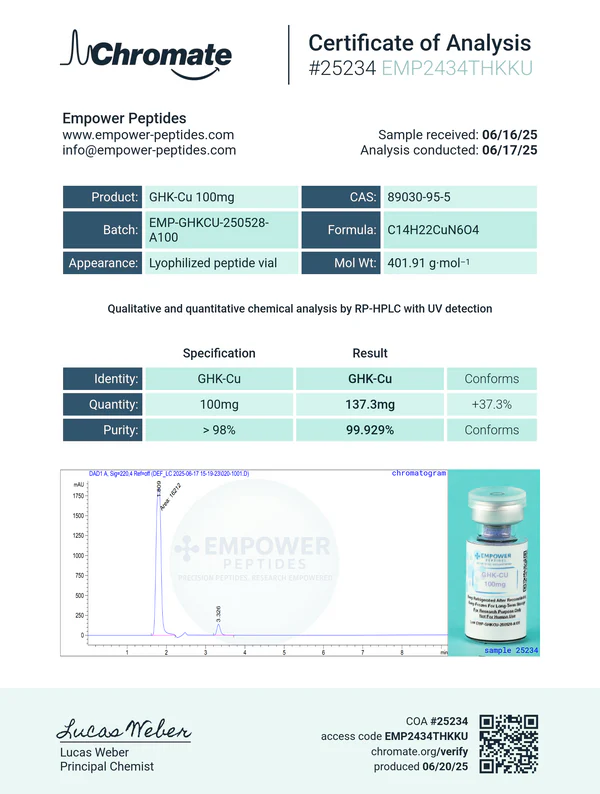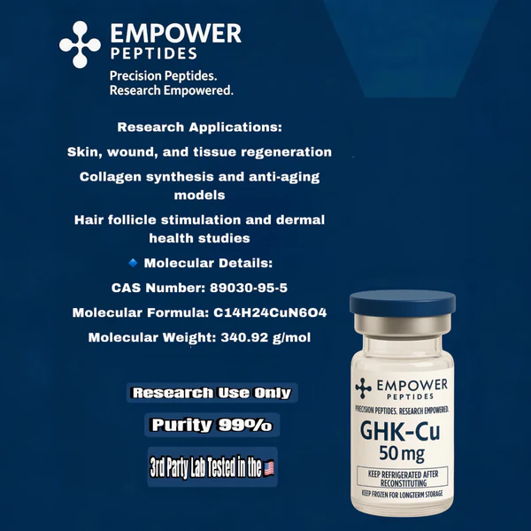 GHK-Cu is a copper-binding tripeptide studied in controlled laboratory environments for its role in cellular signaling, metal-ion interaction pathways, and extracellular matrix research models. Its structure—composed of glycine, histidine, and lysine—allows researchers to examine copper-peptide complexes across a wide range of experimental systems.