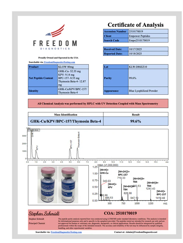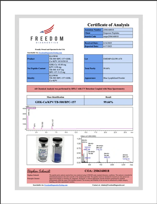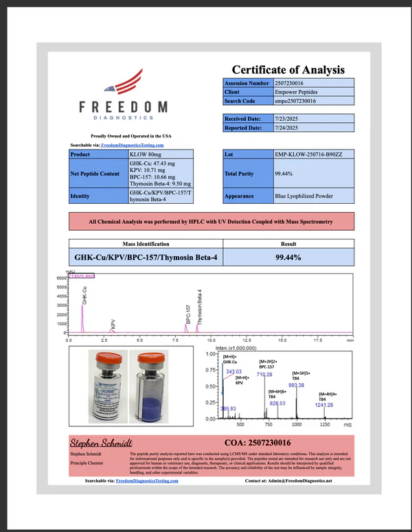KLOW is a research-grade peptide blend combining four well-characterized components—TB-500, BPC-157, GHK-Cu, and KPV. This formulation is utilized in controlled laboratory settings to investigate cellular signaling, tissue-support models, and inflammation-related pathways. Each component is provided individually at ≥98% purity to support high-fidelity experimental design.