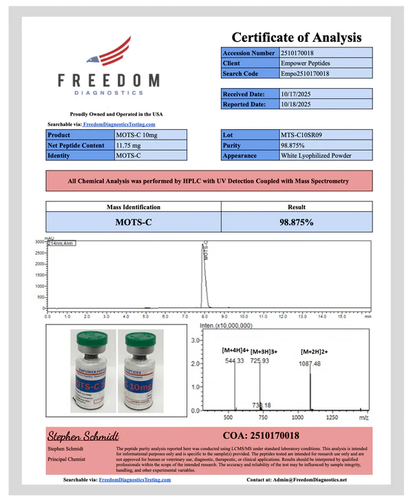 MOTS-c is a 16–amino acid mitochondrial-derived peptide widely examined in laboratory environments for its role in cellular signaling, metabolic regulation pathways, and mitochondrial response models. Researchers use MOTS-c to explore biochemical mechanisms involving energy-related processes, stress-response signaling, and metabolic pathway interactions.