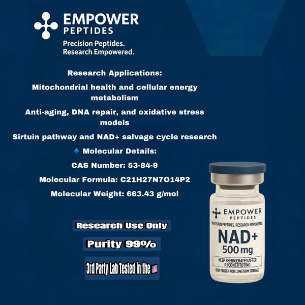 NAD+ is an essential biochemical cofactor widely examined in research involving cellular energy pathways, redox reactions, and enzymatic mechanisms. In laboratory models, NAD+ supports investigations into oxidative metabolism, electron transfer reactions, and cofactor-dependent biochemical signaling pathways.