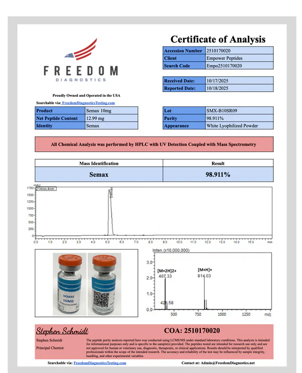 Semax is a synthetic heptapeptide derived from the ACTH(4–10) fragment and is widely examined in laboratory environments for its roles in neurological signaling, peptide–receptor interactions, and regulatory pathway modeling. Its defined amino acid structure makes it a useful tool for exploring mechanisms related to central nervous system pathways and neuroregulatory peptide behavior.